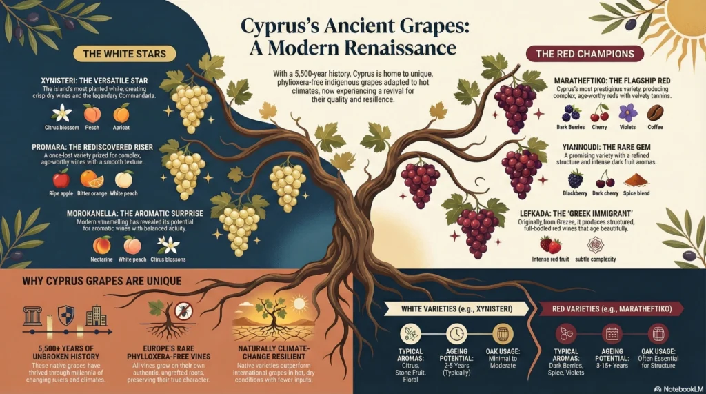 The indigenous grape varieties of Cyprus are unique for several reasons: they’ve evolved over 5,500+ years to thrive in hot, dry Mediterranean conditions without irrigation; they grow ungrafted on their own roots since Cyprus is phylloxera-free; they produce distinctive flavor profiles impossible to replicate with international varieties; and many survived near-extinction only to be rediscovered in the late 20th century. Research confirms they outperform international varieties like Shiraz and Sauvignon Blanc in hot, dry conditions while requiring fewer inputs and producing lower carbon footprints.