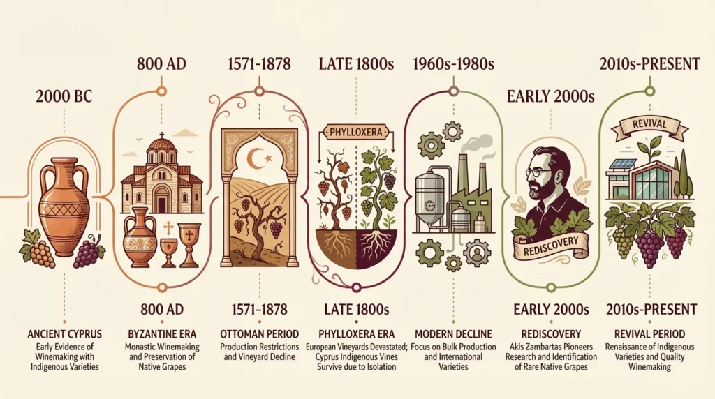 For centuries, Cyprus’s indigenous grapes nearly vanished. During the 300-year Ottoman occupation, commercial wine production was prohibited, and heavy taxation caused many varieties to decline. Only small plantings scattered in family vineyards kept them alive.