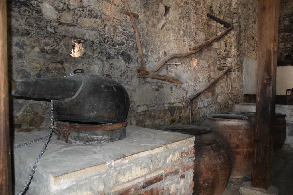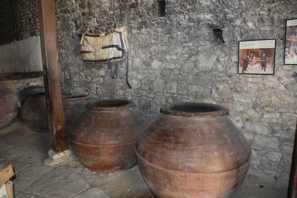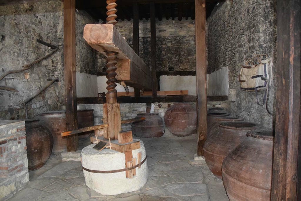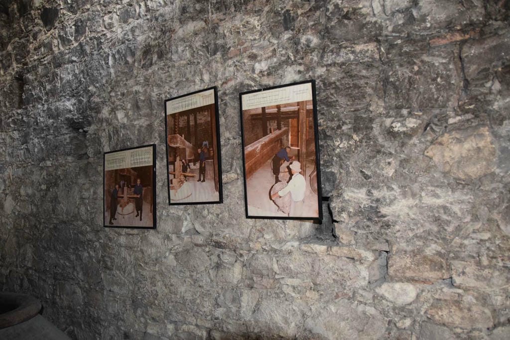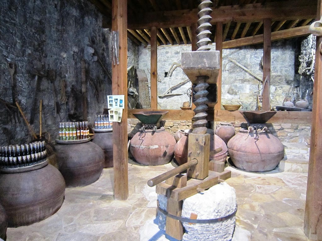At the heart of the room is the spectacular press itself: an enormous double wooden beam that spans the space, ending in a massive wooden screw weighted by a heavy stone. In its working days, grapes were heaped into a large tray under the beam, then covered with sturdy planks. Two workers would turn the screw, raising the stone so that the beam dropped and squeezed the grapes with immense force. The juice ran into partially buried clay or stone vats, which were sealed to ferment and protect the must from spoilage. Although wineries in Omodos now rely on modern equipment, they still cultivate traditional Cypriot varieties such as Xynisteri and Mavro, linking today’s wines to the same landscapes and practices that once animated the Omodos Wine Press centuries ago.